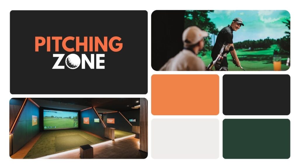 Kräftiges Orange und tiefes Schwarz stehen für Energie und Wiedererkennung, während Grüntöne und Golf-Elemente den sportlichen Charakter unterstreichen. Bildwelt und Farbkonzept positionieren die Marke als modernen, innovativen Treffpunkt für Golfer.
